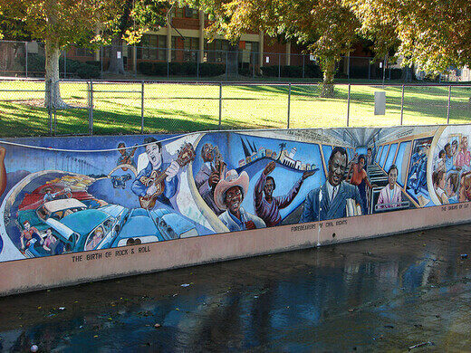 The Great Wall of Los Angeles is a roughly half-mile-long mural painted on the concrete sides of the Tujunga Wash, depicting the history of California from prehistoric times to 1960, as seen through the eyes of women and minorities. Designed in 1978 by artist Judy Baca and created with the help of over 400 community youth and artists, the Great Wall is listed on the U.S. National Register of Historic Places. Current work is underway to add an additional half-mile of mural on the opposite side of the wash, portraying the period from 1960 to 2010. Carpool from the meeting place, Pasadena Museum of History. Enjoy a no-host lunch at a local restaurant after the tour. This event is not suitable for those using walkers or wheelchairs. Please wear comfortable shoes.